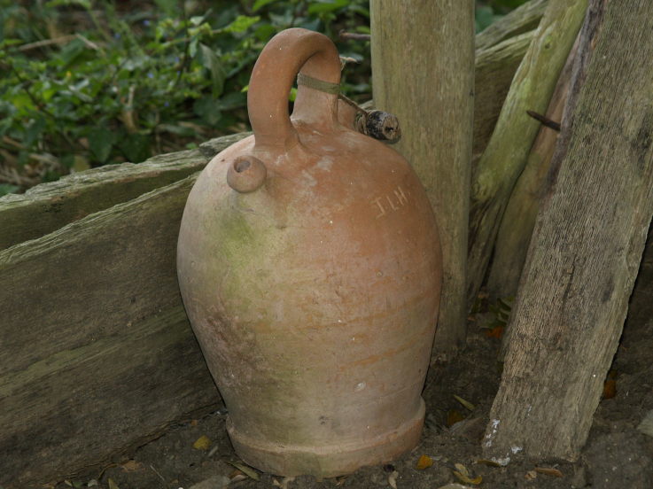Entre tablas de una vieja pared, algunas puntillas amenazan con pincharlo y el verde de la hierba que tal vez algún día sus gotas humedecieron descansa el viejo porrón campesino