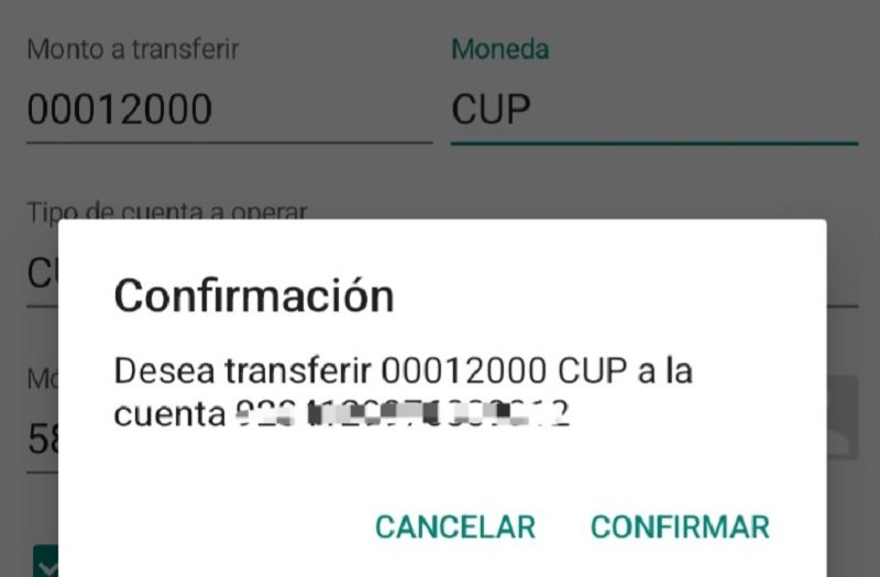 Según la jefa de Banca Electrónica, otro de los elementos que deben revisar los usuarios es el mensaje que manda la aplicación para confirmar las operaciones. En este caso, como se trata de una transferencia, la plataforma preguntará si desea transferir 00012000 CUP al número de cuenta que le pidieron colocar.