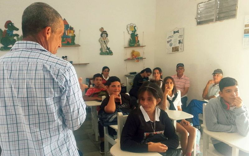 Avilio Crespo Rodríguez, al frente de la escuelita rural primaria Ismaelillo, comunica a un grupo pequeño de alumnos de Secundaria Básica que residen en La Amistad —en el mismo sitio donde está ubicada la escuela— cómo en las próximas semanas, debido a la situación actual del país, recesarán de sus viajes diarios al poblado de Zaza del Medio, donde reciben clases en la ESBU José Antonio Echeverría, para acogerlas en su centro.