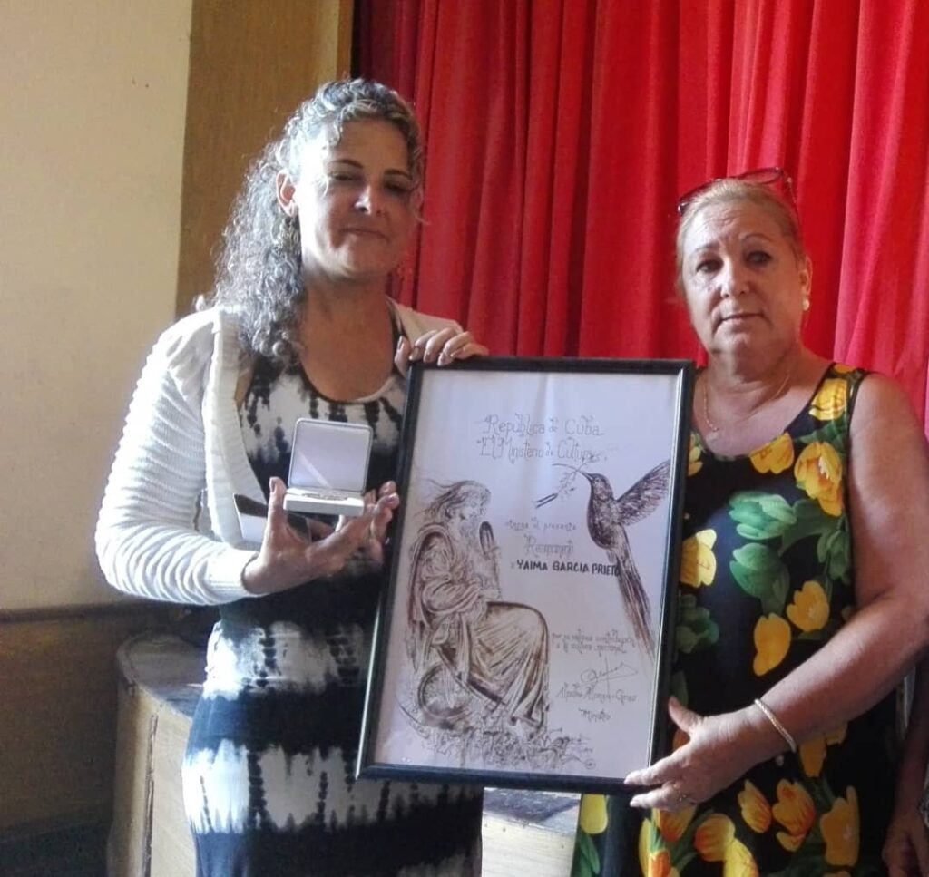 Yaíma García Prieto, instructora de arte de la casa de cultura Arturo Alonso Díaz de Cabaiguán, recibió el reconocimiento del Ministerio de Cultura de Cuba, con la firma de Alpidio Alonso Grau, ministro del ramo, por los aportes al movimiento artístico y cultural de la comunidad y por preservar las tradiciones campesinas y canarias.